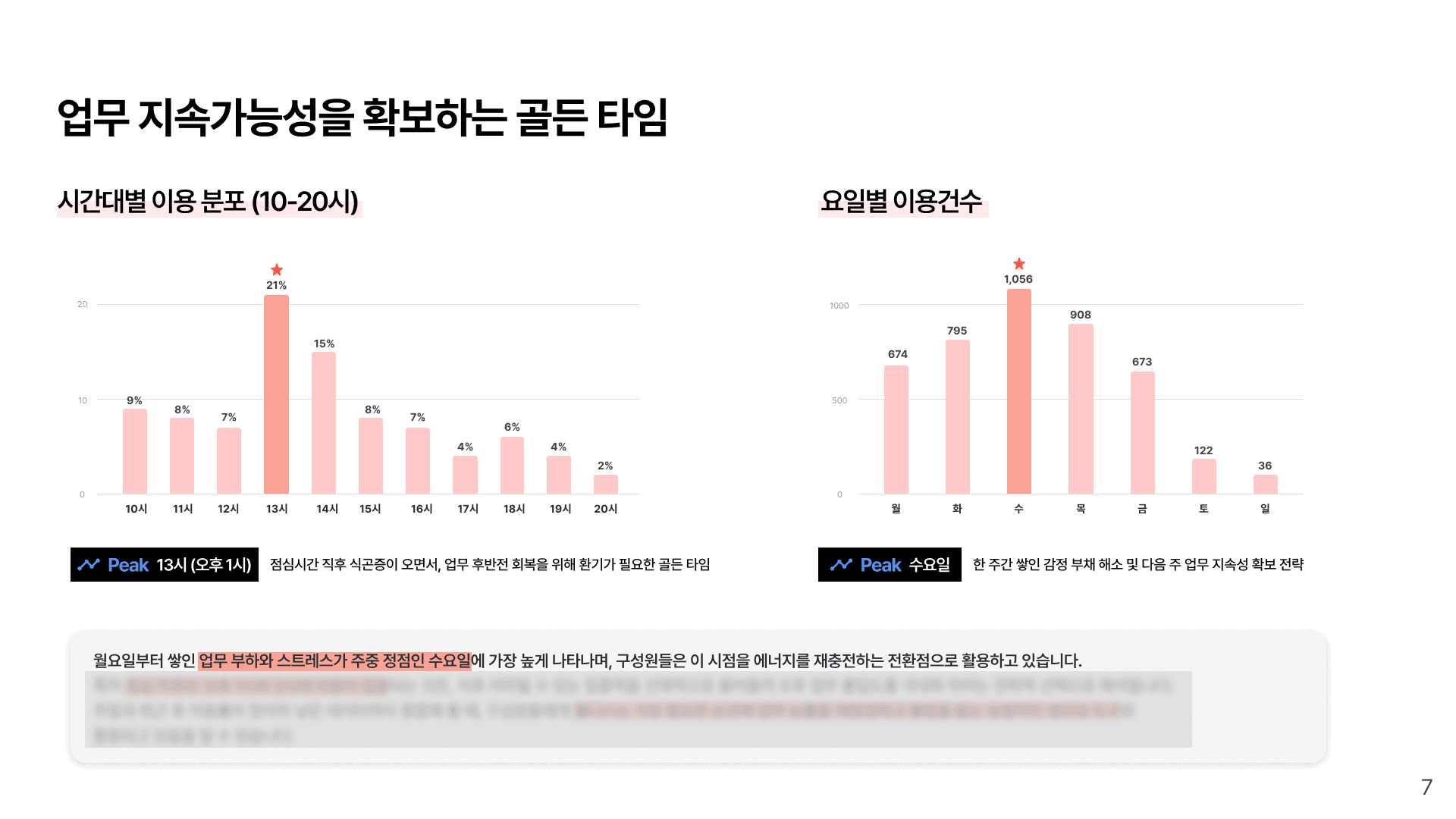 전체 이용의 21%가 집중되는 수요일 점심 직후. 상위 1% 조직은 이 시간을 어떻게 '오후 업무 몰입을 위한 전략적 리셋 타임'으로 활용하고 있을까요?