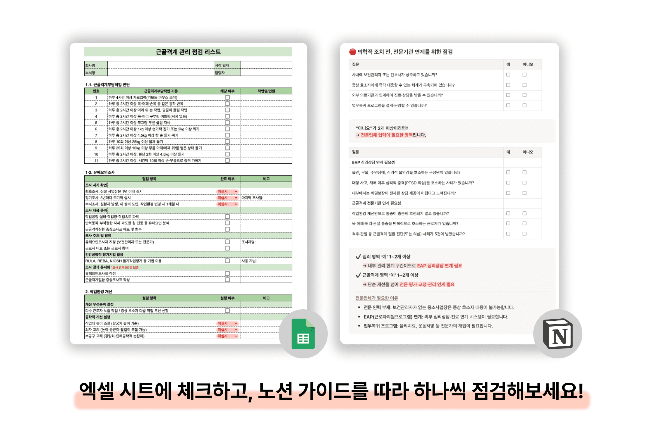 2. 작업환경 개선부터 근로자 교육까지 실행 체크리스트 | 공학적·관리적·행동적 개선 항목과 교육 계획 수립 가이드를 제공해, 조사 결과를 실제 현장 개선으로 연결합니다. |
